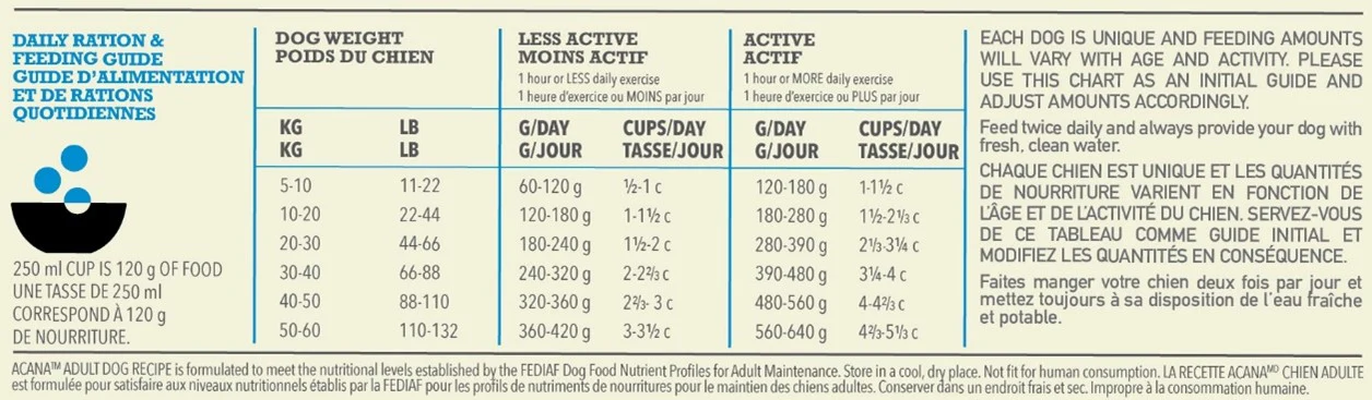 When it comes to ACANA™ food for dogs, we’re obsessed with every ingredient that goes into our premium recipes made in Canada. That’s why our Adult Dog Recipe is thoughtfully crafted with ingredients that help meet the needs of all medium breed adult dogs. Made with 60% quality animal ingredients like fresh chicken and raw hake balanced with 40% (1) fruit and vegetables (2) like fresh whole pumpkin, greens, apples and pears, this recipe provides the nutrition and animal protein your adult dog needs to live their best life. These wholesome ingredients are provided by suppliers we know and trust, and our vets and pet nutrition experts carefully craft each recipe with the goal of making your pet feel so good inside, you’ll see it on the outside.